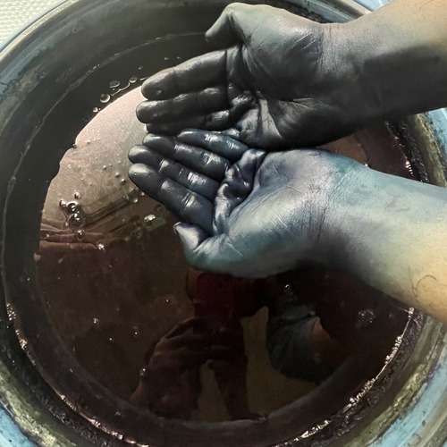 私たちが種から育てた藍(白花小上粉)を、発酵させて作った「すくも」で、精麻を全て染めました。